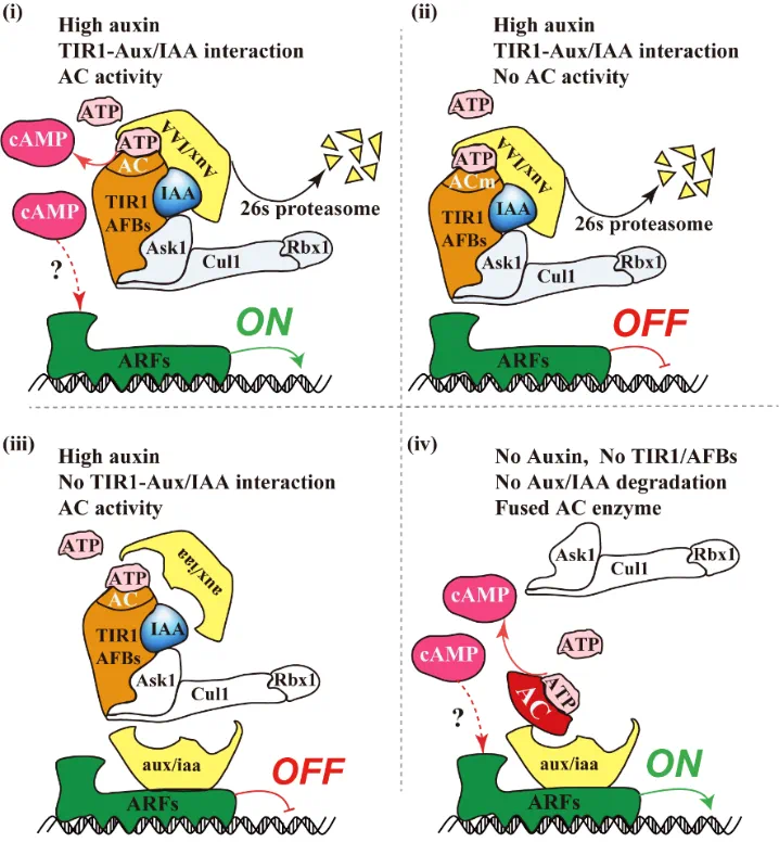 The research demonstrates that the loss of AC activity in the auxin receptor TIR1/AFB does not impair Aux/IAA protein degradation but disrupts auxin-induced transcriptional regulation, indicating that Aux/IAA degradation alone is insufficient to fully mediate the auxin transcriptional response. Furthermore, by inducing the expression of artificially constructed fusion proteins to produce cAMP near the Aux/IAA-ARF complex, the study shows that this approach can bypass TIR1/AFB auxin perception and Aux/IAA degradation pathways. Even in the presence of stable Aux/IAA transcriptional repressors, cAMP can still activate ARF transcription factor-mediated transcriptional reprogramming, mimicking auxin’s biological effects (see figure below). This suggests that, in this experimental system, cAMP is sufficient to initiate the auxin transcriptional response. The study not only provides genetic evidence confirming cAMP as a second messenger in plants—a topic of historical debate—but also revises the theoretical framework of the classical auxin signaling pathway. Notably, the core assertion of the classical model, that “Aux/IAA degradation is a sufficient and necessary condition for mediating auxin transcriptional responses”, shifts to a scientific question requiring re-examination, paving the way for new theoretical explorations in future research.