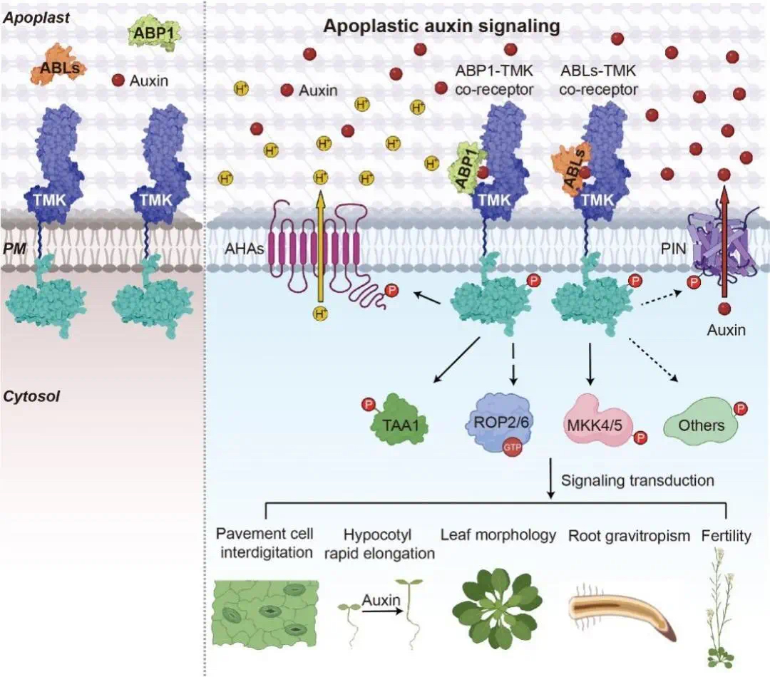 This study provides the first molecular biology explanation for the longstanding question of how plant cells perceive extracellular auxin signals. It unveils the molecular mechanism by which the ABP1/ABLs-TMKs co-receptor complex at the plasma membrane transmits auxin signals to regulate plant growth and development. This breakthrough in plant hormone signal transduction offers new insights for dissecting the complex and diverse biological functions of auxin.