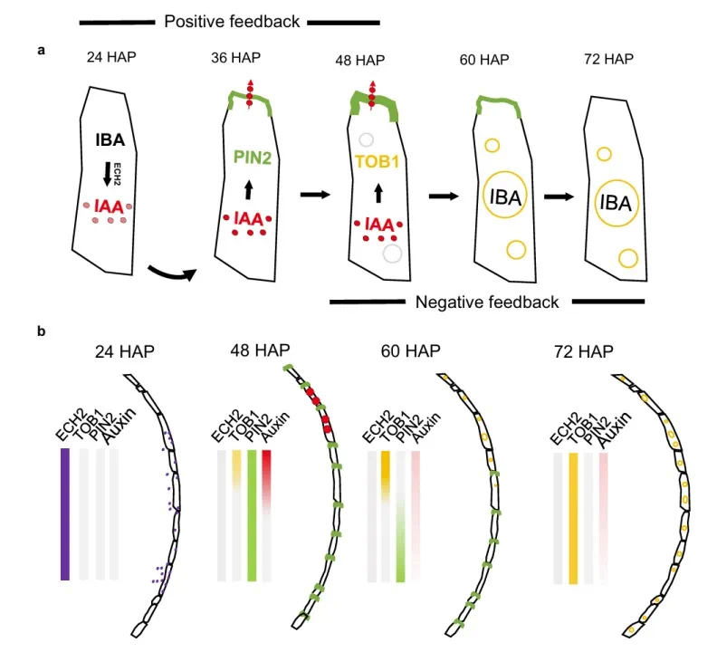 Further analysis revealed that, at the early-stage the auxin precursor indole-3-butyric acid (IBA) is converted into active indole-3-acetic acid (IAA) in marginal cells, promoting PIN2 accumulation and polarized targeting. As auxin levels rise at the cotyledon tip, a TOB1-mediated mediated negative feedback is triggered: vacuolar sequestration of IBAvia TRANSPORTER OF IBA1 (TOB1), terminating PIN2 accumulation and completing this dynamic self-regulatory auxin flux.